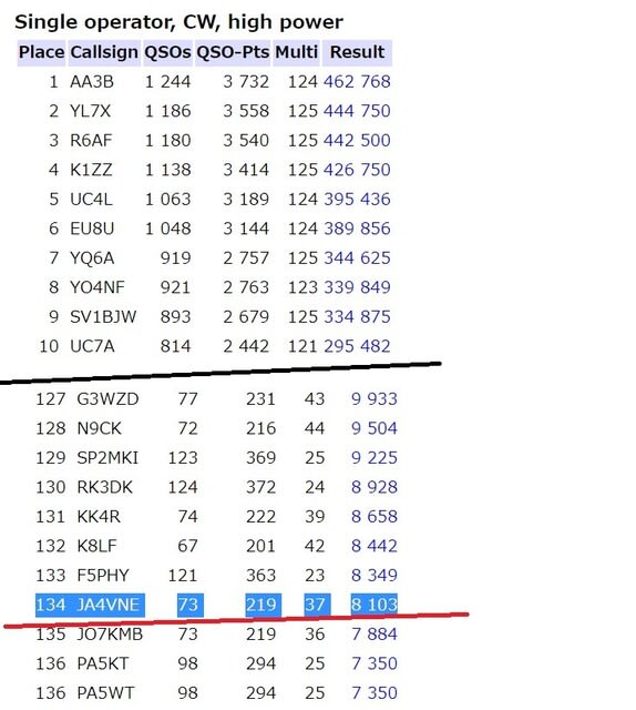 結果は シングルオペCW HP部門 のドイツ外局で、134位/176局中でした。当局のSystemは、200W+2エレ。21MHzより28MHzの方が良く飛びました。