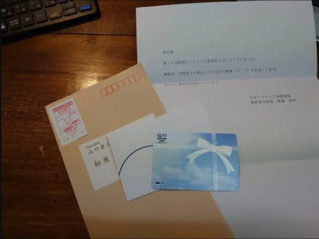 今日(1月12日)帰宅すると、JARL福岡県支部コンテスト担当様から封書が届いていました。開封すると、 福岡コンテスト 参加のお礼文と参加賞 のQUOカード入っていました。コンテスト規約に【 県内局が 20 局以上と交信し、ログ・サマリーを提出した局に参加賞を贈る 】という一文があり、当局も参加賞の対象となり送っていただいた次第です。