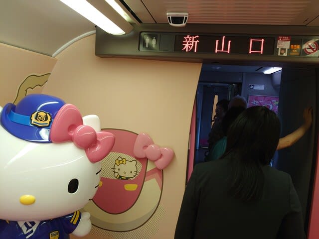 ハローキティ新幹線 先頭車両(1号車)はこんな感じでした。キャラクターグッズを並べたショップや展示スペースでしょうか? 係りのお姉さんが入り口に2人座っていて、さすがにこの先は " 場違い " な空間なので進むことができず、撤退することにしました。