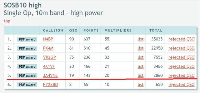結果は、SOSB10high (10m Band )で、19 QSO's 世界5位/6位中 という順位でした。 世界〜 といっても、この部門の参加は6局でJ Aは 当局のみです。JAのContester各局は、同時期 開催だった JIDX Contest Phone の方に行かれてましたかね?