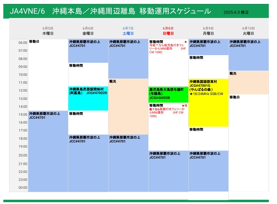 運用バンドは主に14MHz以上でコンデション任せ(hi)、モードは CWとSSB。すべて那覇市からの日帰り移動なので、運用時間は限られています。上のスケジュール表を参考にワッチいただけると助かります。聞こえていましたら、ぜひコールをお願いします。