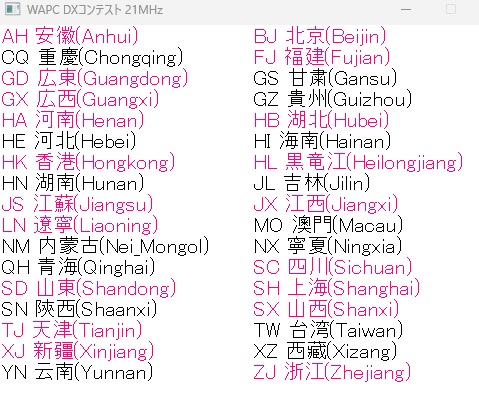 21MHzでの獲得マルチ(省)は上のとおりで、73QSOマルチ25。内、BY国内(VR2含む)は19/34マルチ(省)でした。そしてBYと緊張関係にあるBVも(名目上)台湾省としてマルチに加えられています。当然ながら、BV局は参加していませんけどね。なお、21MHzでBY以外の獲得マルチ(DXCCエンティティ)は、DU、HL、JA、LZ、T8、YBでした 。