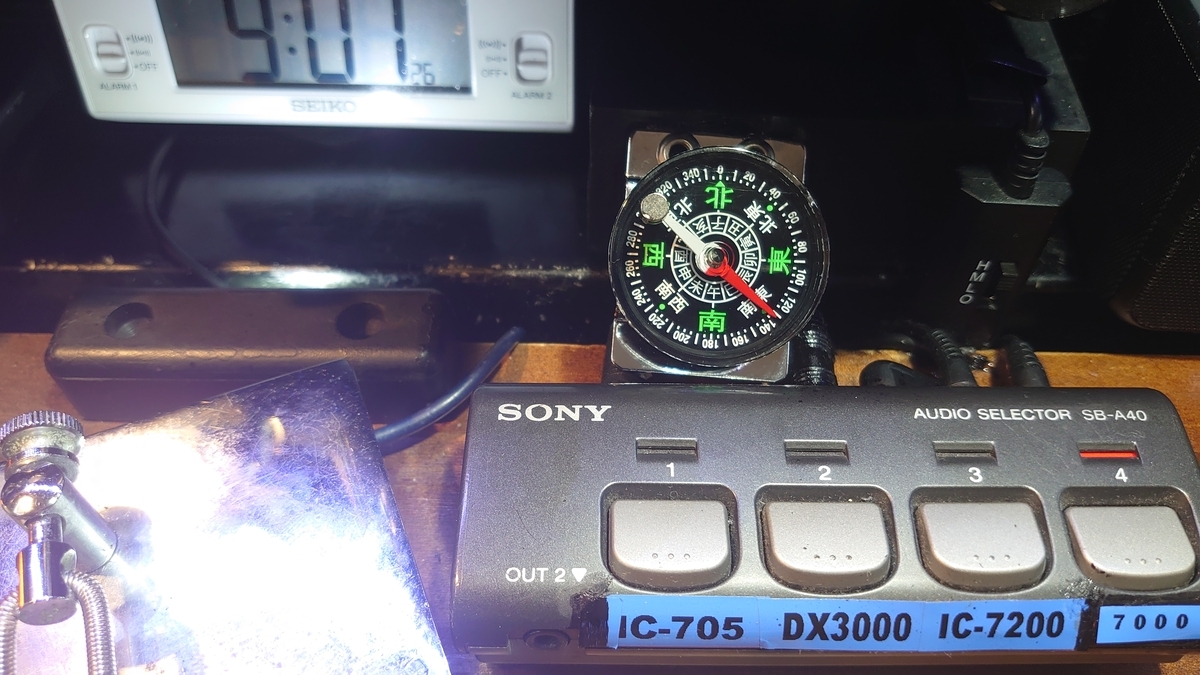 衛星のパス時間になると運用に熱中しているので、『今、アンテナどこ向いてたっけ?』ということがよくあるので、シャックの目につくところに100均で買ったコンパス(方位磁石)を貼り付けました。